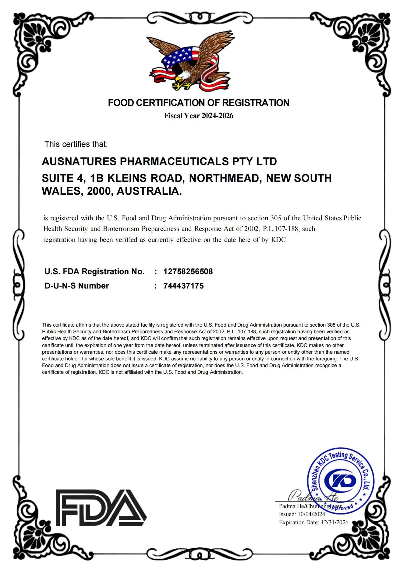 Food certification of registration