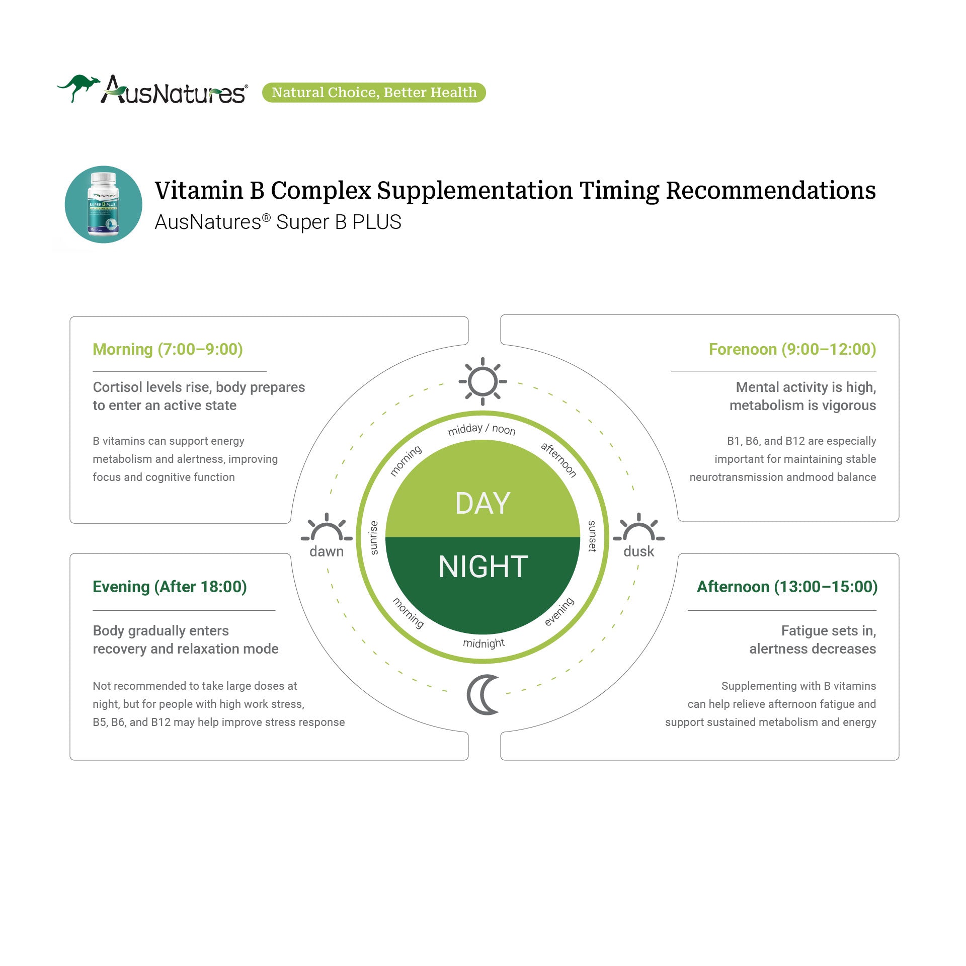 Experience the difference that complete B vitamin nutrition can make in your daily energy, stress resilience, and overall wellbeing with AusNatures® Super B Plus.